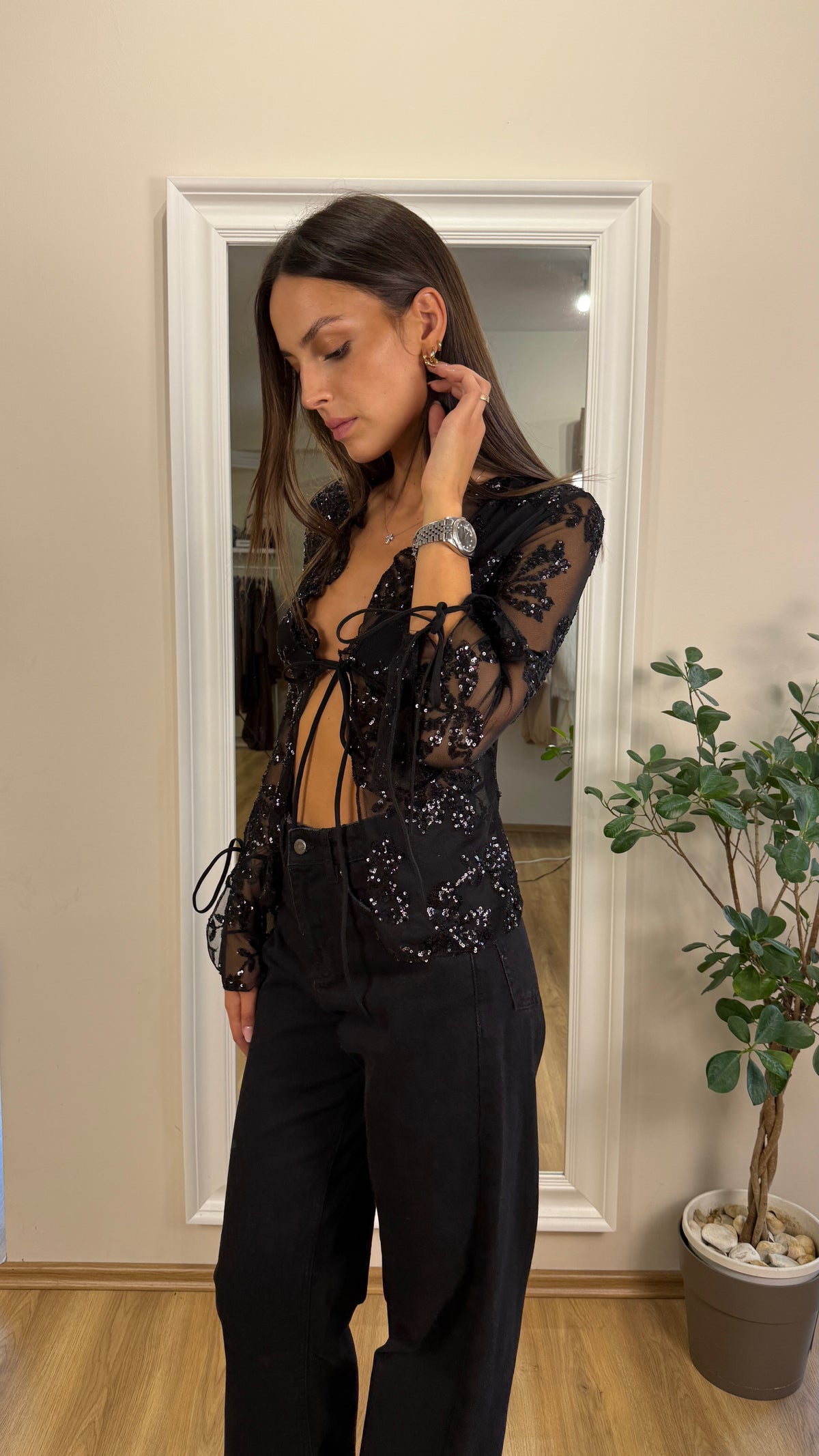 Blusa ricamata con paillettes e trasparenze, foderata sul seno.