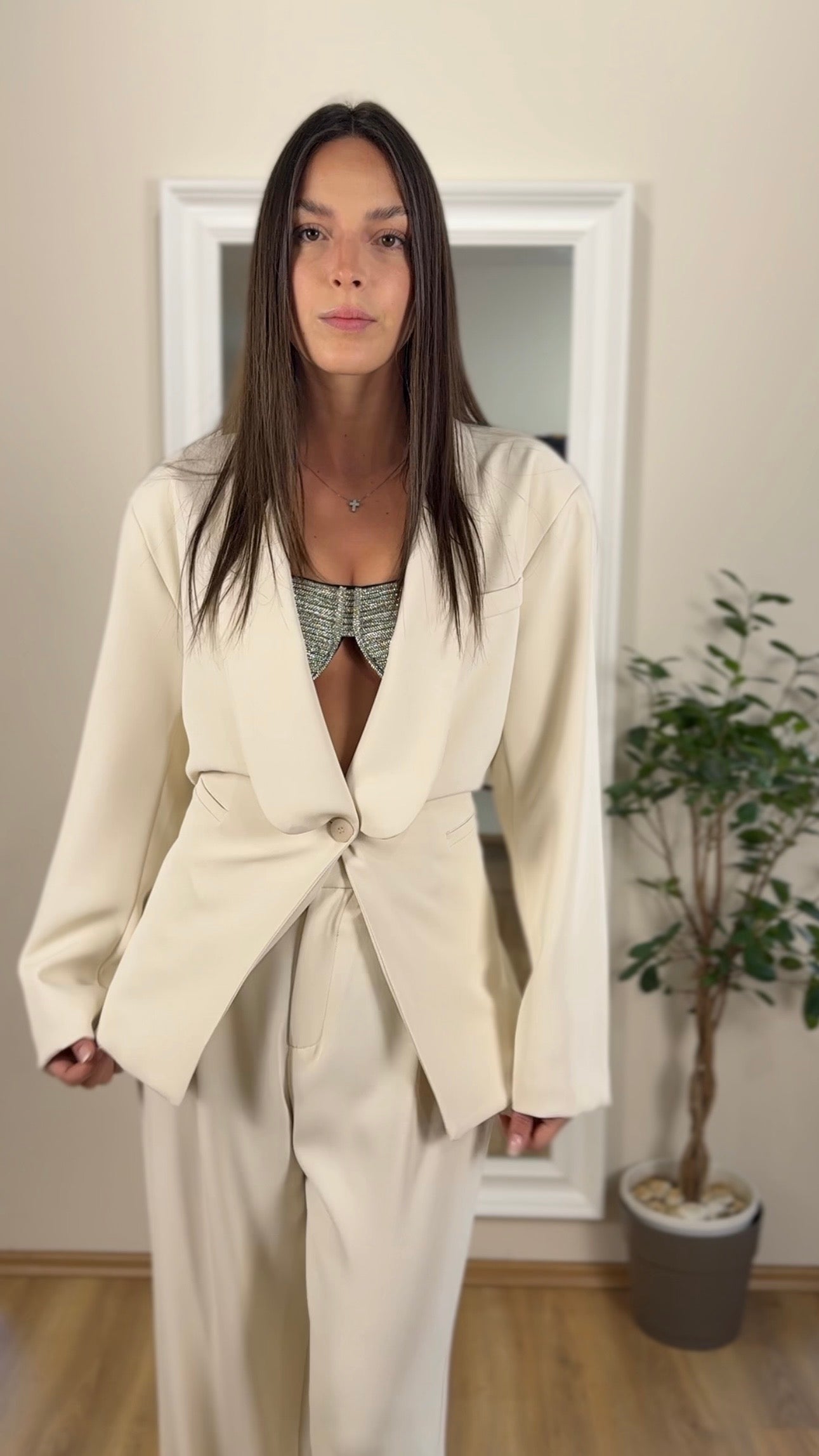Completo, giacca con cinta avvitata e pantalone a palazzo con coulisse posteriore.