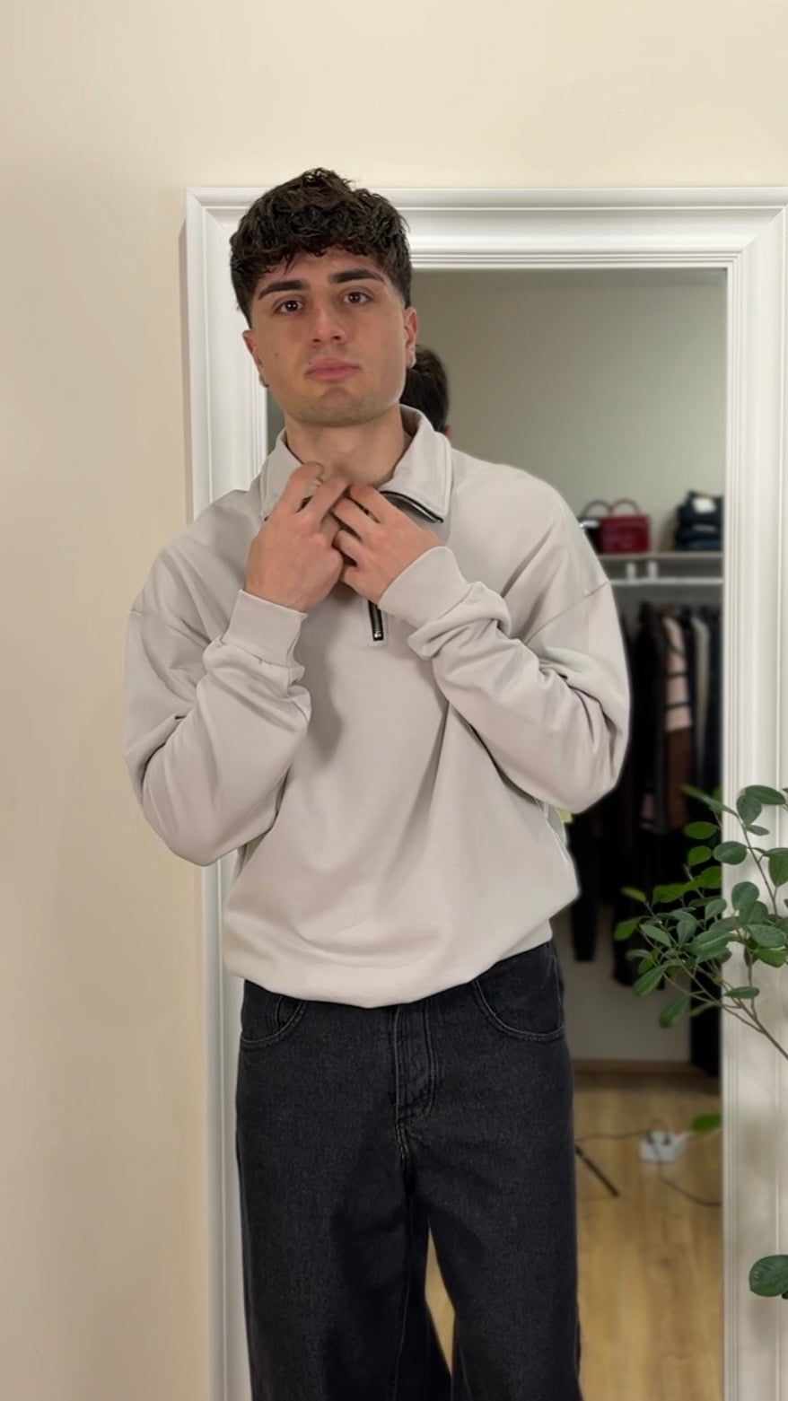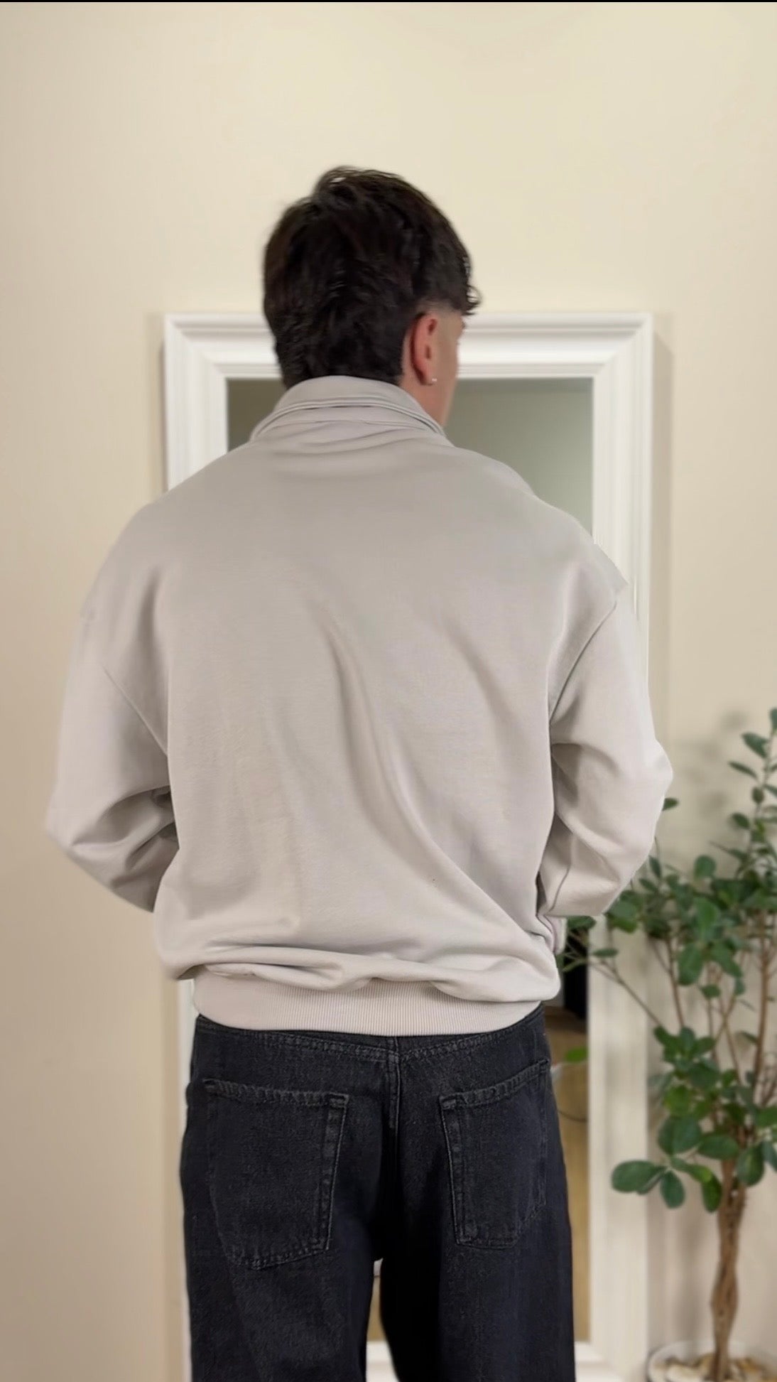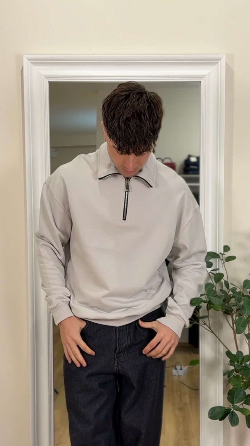 Felpa garzata, mezza zip, color ghiaccio, vestibilità regolare.