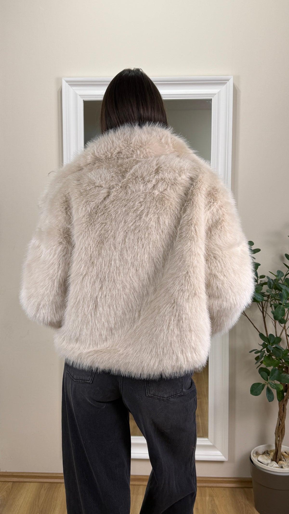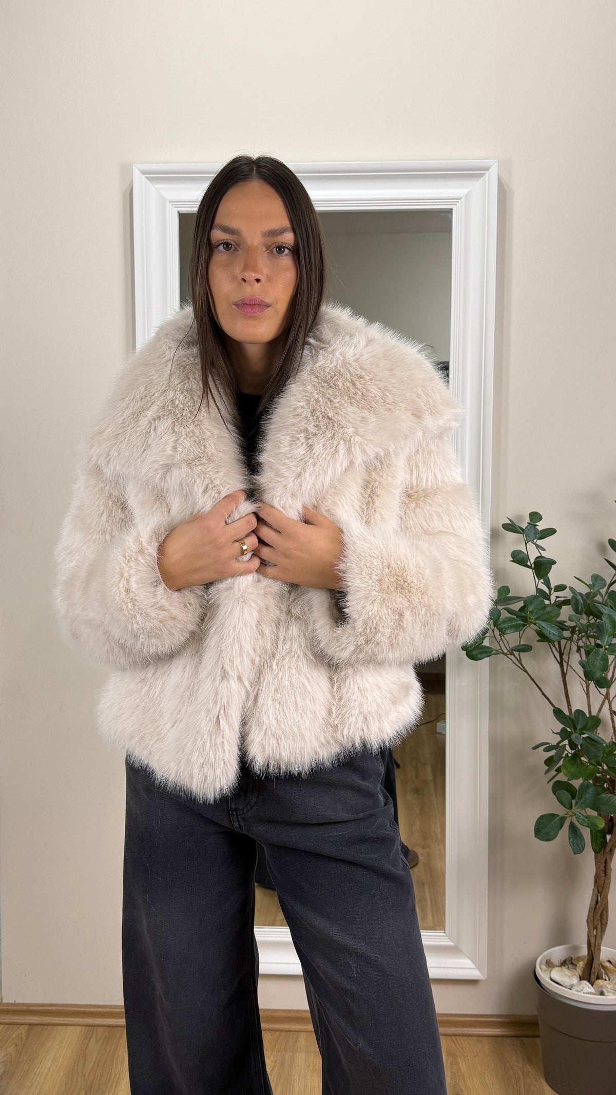 Pelliccia ecologica con colletto ampio, color panna.